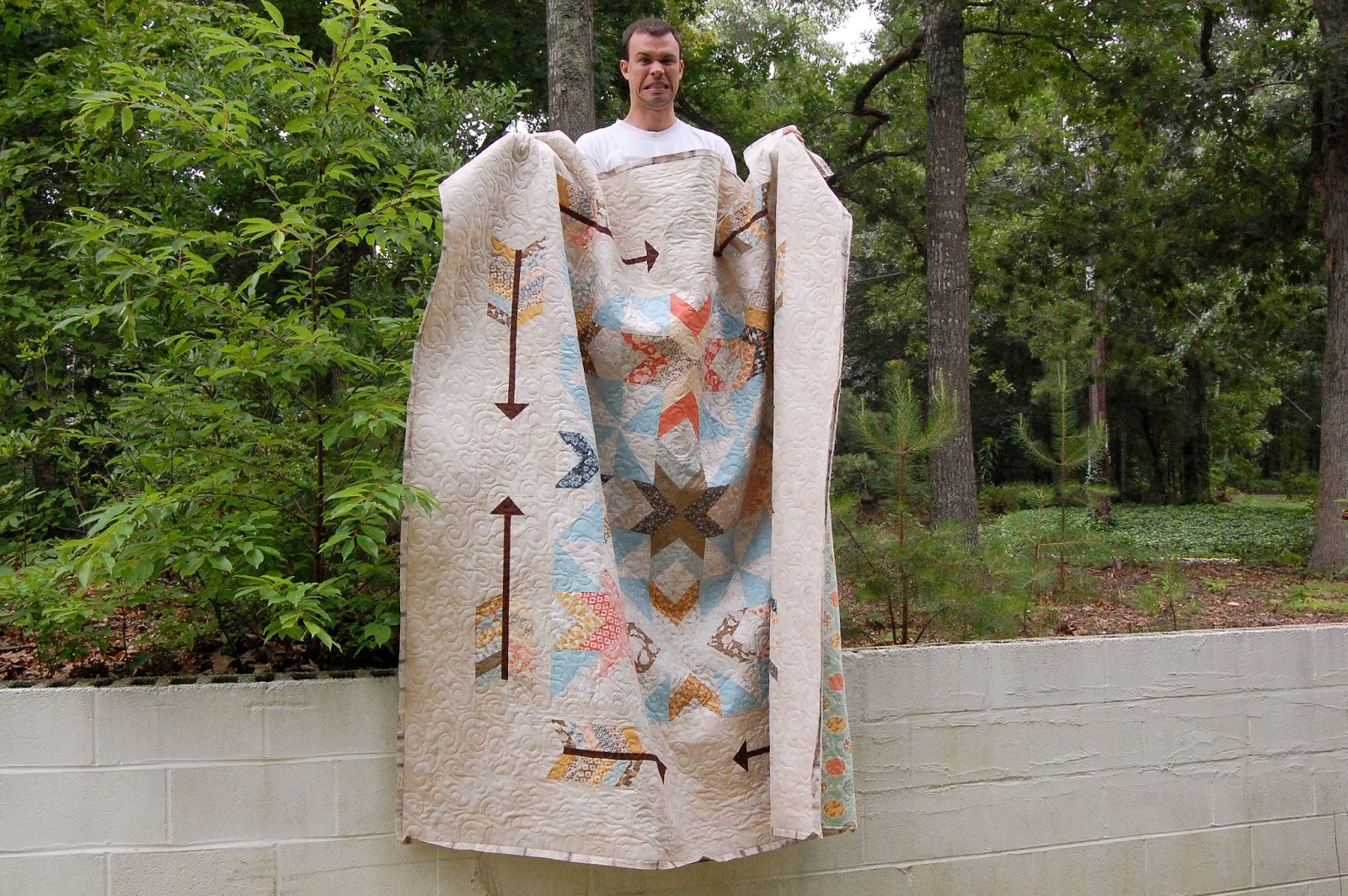 Wes is on a three-week deployment until the end of the month, but I had him hold up the quilt for me before he left. The binding wasn't handstitched yet, but I wanted documentation, dang it! ;) Luckily, Kerstin also sent me some pictures after I got back.